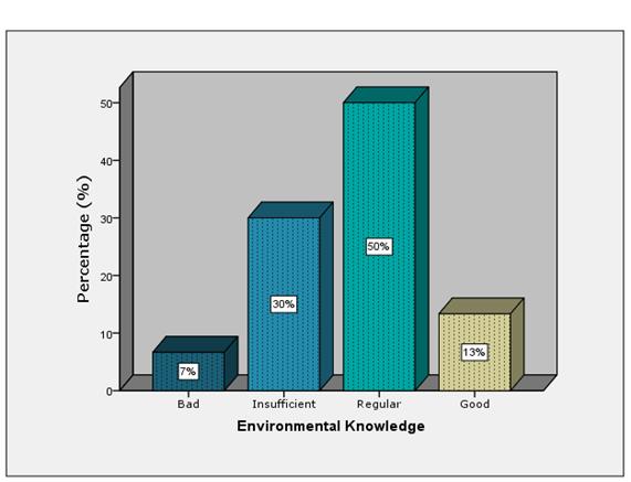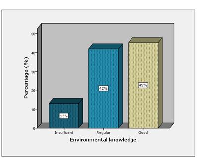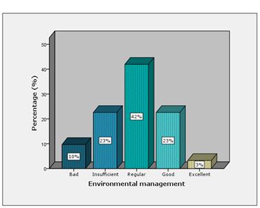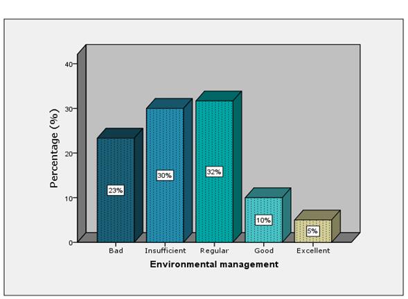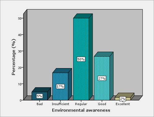 In general, the results of the survey are presented per domain in Figure 5, Figure 6 and Figure 7. A small percentage (27%) has a good level of environmental awareness. For its part, a 37% is between bad and insufficient levels and for the perception of environmental management a low 15% is between good and excellent.