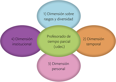 Cabe mencionar que, la conformación de una indagación sistematizada acerca del profesorado por horas en la UdeG conllevaría previamente el procesamiento de una serie datos que permitan trazar rutas explicativas en el contexto institucional señalado. A partir de esa limitación, la propuesta es de tipo teórica . Declarado lo anterior, se conjeturan cuatro dimensiones, que interrelacionadas y coordinadas, facilitarán la construcción de una tipología constructiva contextualizada. Las dimensiones son: 1) dimensión sobre diversidad de rasgos (heterogeneidad), 2) dimensión temporal, 3) dimensión personal y 4) dimensión institucional (Gráfico 1).