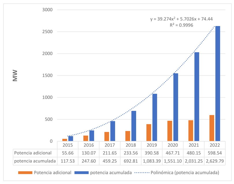 Como se muestra en la gráfica 1, tanto el número de contratos de interconexión como la capacidad instalada adicional de GD por año de 2015 a 2022 es creciente, de tal manera que la capacidad acumulada tiene un crecimiento cuadrático de acuerdo con la ecuación 1: