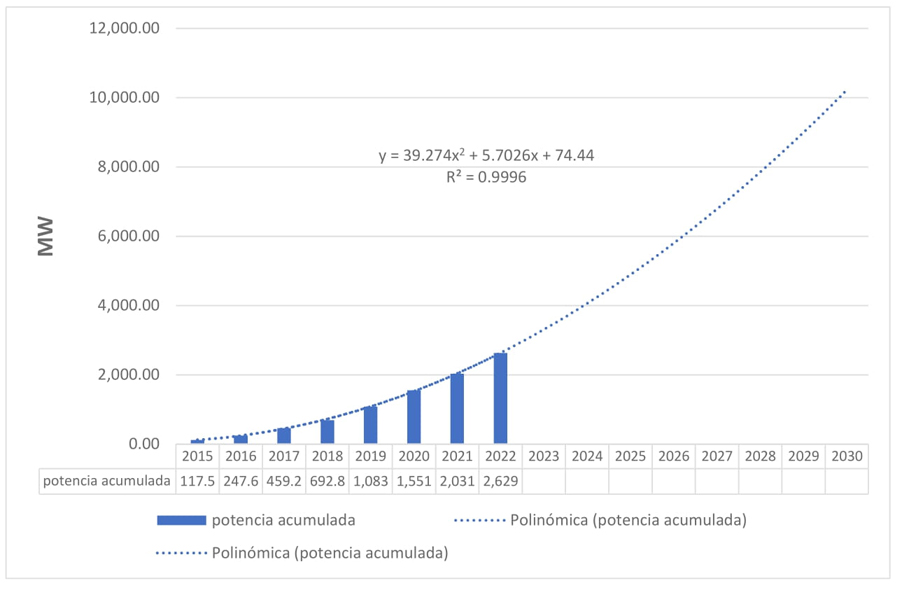 Donde Y es la capacidad instalada acumulada en MW y X es el año en cuestión, con un coeficiente de determinación R2 de 0.9996. Esta ecuación permite proyectar el crecimiento de la capacidad instalada de GD para 2030, y se representa en la gráfica 2.
