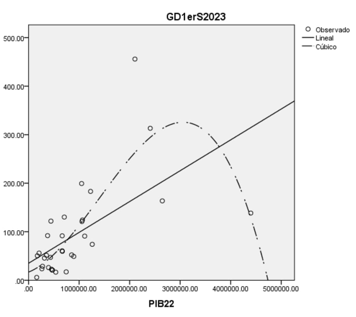 Con el objetivo de analizar la relación entre estas variables, se realizó un modelo de regresión lineal considerando como variable dependiente la capacidad instalada en la GD y como variables predictoras la radiación solar promedio en la capital del estado y el PIB 2022 en el estado. En este modelo de regresión lineal se empleó el método hacia atrás en el programa SPSS, con el cual se eliminó la variable radiación por no ser significativa (P>0.05), quedando como significativa solo la variable PIB 2022 en la relación lineal con un coeficiente de determinación R2 de 0.358. Al considerar bajo este valor de R2, se exploraron otras estimaciones curvilíneas encontrándose la de tipo cúbico con el mayor R2 de 0.632, expresado en la ecuación (2) y en la gráfica 3.