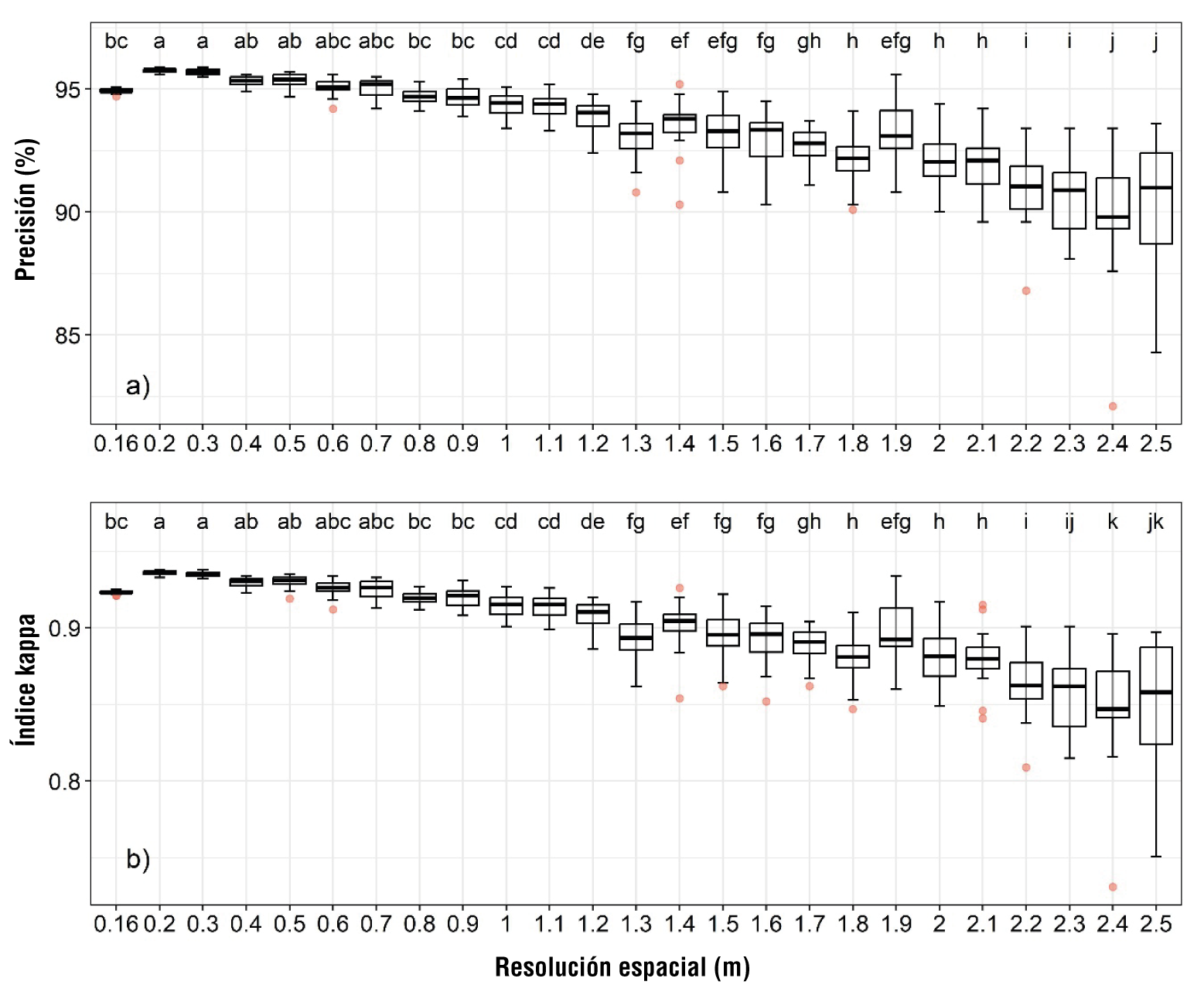 Figura 3 Efecto de la resolución espacial de imágenes multiespectrales tomadas con drones en la clasificación de la cobertura terrestre: precisión e índice kappa. En cada gráfica, letras diferentes indican diferencias estadísticas significativas de acuerdo con la prueba estadística no paramétrica de Mann-Whitney-Wilcoxon (p < 0.05). Los puntos rojos indican valores atípicos.