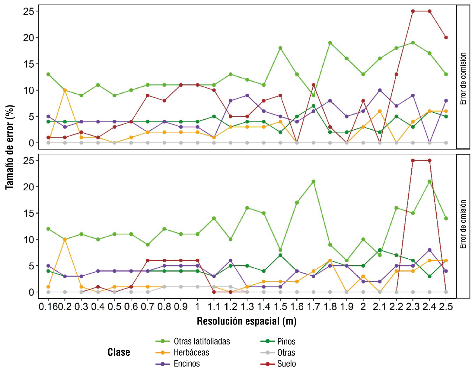 De acuerdo con la Figura 4, el efecto de la resolución espacial de la imagen en los errores de omisión y comisión varió a lo largo del intervalo evaluado. Para las imágenes con una resolución espacial de 0.2 a 1.2 m, los errores de omisión y comisión en la clasificación fueron menores y constantes; por el contrario, para las imágenes con una resolución espacial de 1.3 a 2.5 m, los errores fueron mayores y más variables.