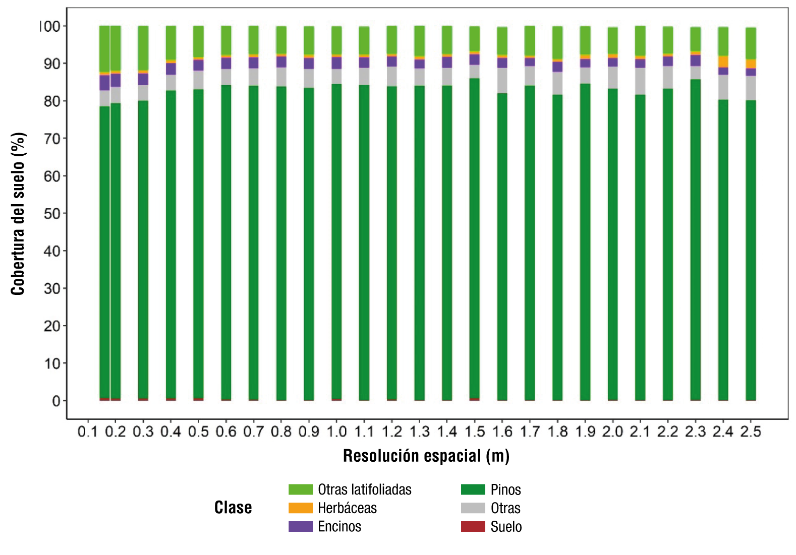 Las imágenes espectrales se preprocesaron en resoluciones espaciales desde 0.2 hasta 2.5 m, a intervalos de 0.1 m. La cobertura de pinos, encinos, otras latifoliadas, herbáceas y suelo desnudo se clasificaron con el algoritmo Random Forest. El efecto de la resolución espacial en la clasificación de la cobertura terrestre se evaluó mediante la prueba no paramétrica de Kruskal-Wallis seguida de una comparación post-hoc Mann-Whitney-Wilcoxon (p < 0.05). Los errores de clasificación de las clases de cobertura se analizaron gráficamente.