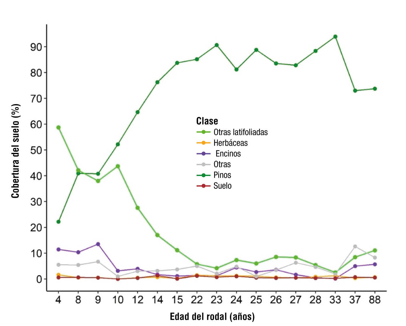 En los rodales jóvenes (<15 años), la clasificación de la vegetación mostró una cobertura elevada de encinos y otras especies de latifoliadas, lo que concuerda con el proceso normal de sucesión ecológica de los bosques templados gestionados. Las primeras especies leñosas que crecen tras una corta de regeneración son las latifoliadas como Quercus sp., Prunus, Alnus, Clethra, Cleyera, Cornus, Turpinia y Vaccinium. En las etapas de plántula y brinzal, las copas de las latifoliadas tienden a ser más grandes que las copas de los árboles Pinus y, por lo tanto, cubren un área mayor. Además, la regeneración de estos géneros es mediate brotes que emergen de los tocones, por lo que crecen más rápido durante los primeros años posteriores a la corta de regeneración (Alanís-Rodríguez et al., 2011). No obstante, las actividades silvícolas como limpias y aclareos reducen la presencia de latifoliadas y promueven el establecimiento y crecimiento de pinos (Figura 6).