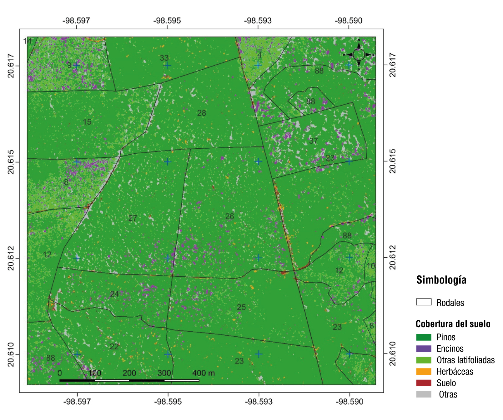 La cartografía tradicional representa las condiciones de los rodales como una sola clase de vegetación, mientras que las imágenes de alta resolución diferencian la composición de la vegetación en varios tipos de cobertura (Figura 7). La fina resolución espacial de las imágenes desempeñó un papel importante en la detección de coberturas herbáceas y de suelo desnudo, ya que estas no se detectaron cuando se utilizaron imágenes con una resolución espacial de 2.5 m por píxel; además, en los rodales jóvenes, la presencia de sombra (otras clases) fue menor que en las zonas con árboles altos.