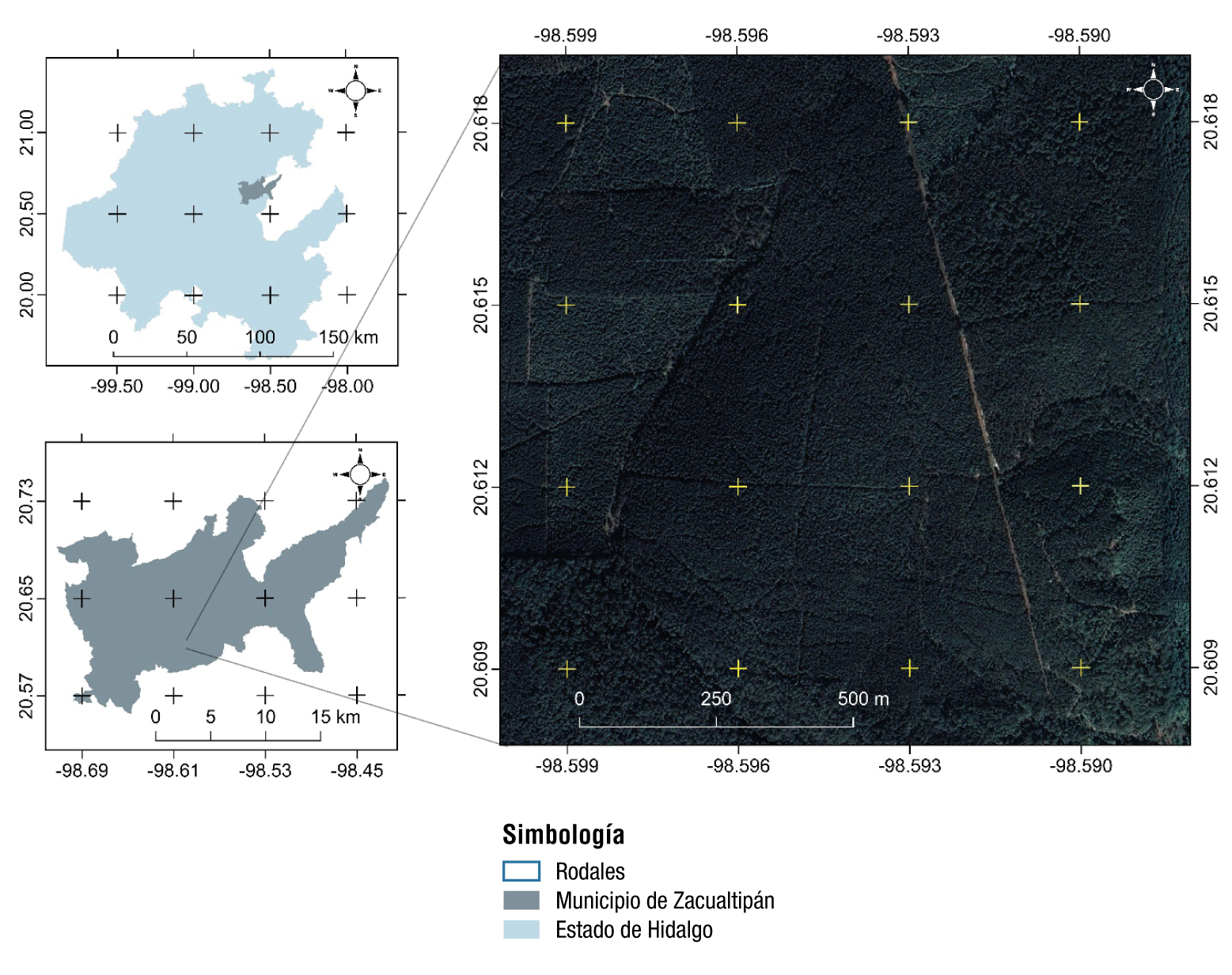 El estudio se realizó en el Sitio de Monitoreo Intensivo de CO2 (SMIC), ubicado entre las coordenadas 20° 35’ 00”- 20° 38’ 30” N y 98° 34’ 00”- 98° 38’ 00” O, al sureste del municipio de Zacualtipán, Hidalgo, México. El SMIC comprende una superficie de 900 ha; sin embargo, por el alcance del dron de ala fija, el presente estudio se limita a sus 100 ha centrales (Figura 1). Esta región es rica en humedad, su precipitación media anual oscila entre 700 mm y 2 050 mm y es común encontrar días nublados a lo largo del año. Si bien, la estación de lluvia se presenta de junio a octubre, el invierno tiene una humedad elevada como resultado de los frentes fríos procedentes del norte, por lo que el clima de la región es clasificado como templado húmedo (C(fm)w”b(e)g) (Ortiz-Reyes et al., 2015).