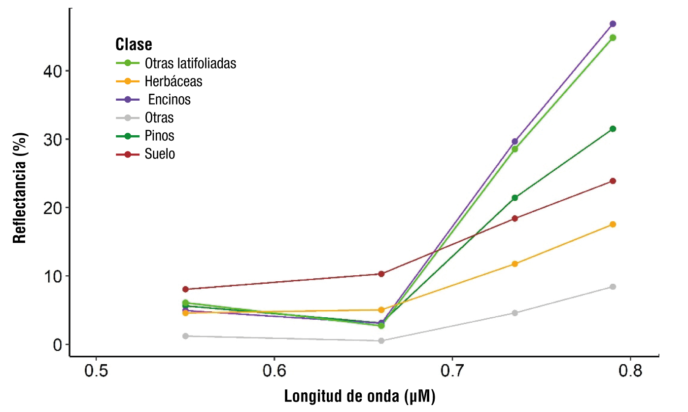 En los rodales del bosque se hicieron recorridos asistidos por el ortomosaico generado a partir de fotografías digitales RGB (Red-Green-Blue, por sus siglas en inglés). Esto permitió la identificación de seis clases de cobertura vegetal: pinos, encinos, otras latifoliadas, herbáceas, suelo desnudo y otras (principalmente zonas de sombra que pueden pertenecer a cualquier otra clase). Se generaron campos de entrenamiento mediante la digitalización de polígonos para cada clase de cobertura, distribuidos en los estadios de desarrollo (edad) de la masa forestal: 100 para pinos, 40 para encinos, 40 para otras latifoliadas, 40 para herbáceas, 40 para suelo desnudo y 50 para otros. Por último, mediante la herramienta de clasificación semiautomatizada de QGIS, se determinaron las firmas espectrales de cada clase para asegurar la separabilidad entre ellas (Figura 2). Las firmas espectrales de los encinos y otras latifoliadas fueron muy similares y pudieron agruparse en una sola clase; sin embargo, se evaluaron por separado, ya que los encinos son especies maderables de interés comercial en la región de estudio.