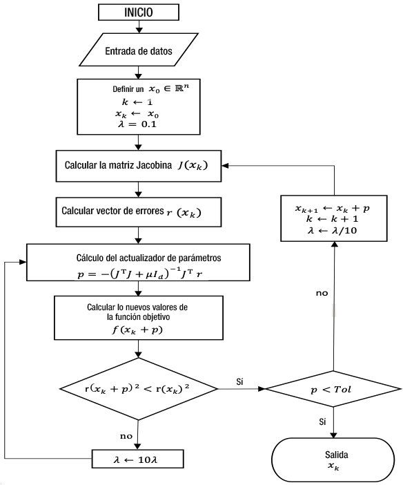 La optimización de los parámetros se codificó en un programa con funciones y subrutinas, las cuales comienzan con un par de valores iniciales, para posteriormente calcular la matriz Jacobiana y el vector de errores. Con esto es posible resolver la Ecuación (3), que da como resultado un par de valores nuevos. Lo anterior permite calcular el vector de errores y revisar si es menor a la iteración anterior dada una tolerancia. En caso de ser mayor a la tolerancia, el algoritmo inicia de nuevo con el par encontrado en la última iteración, y si este vector de errores es menor a la tolerancia, el programa termina e imprime los resultados. El diagrama completo se muestra en la Figura 1.
