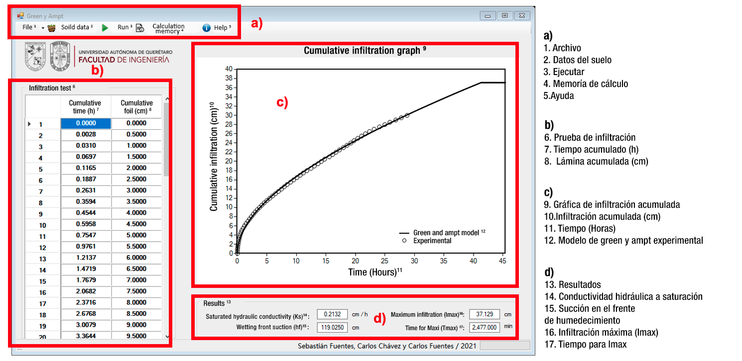 Data from an infiltration test is loaded, including input parameters. / Se cargan datos de una prueba de infiltración, donde también se incluyen sus parámetros de entrada. |