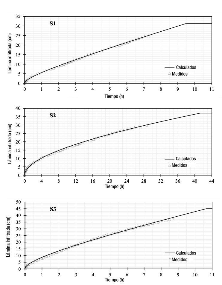 donde S es la sorbilidad del medio poroso (Philip, 1957). Sin el uso de parámetros iniciales relacionados con la textura del suelo, pueden existir una infinidad de parámetros de ajuste de los datos medidos en una prueba de infiltración.