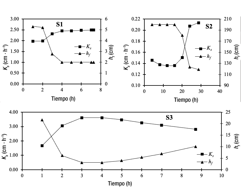 Se realizó un análisis de sensibilidad de los parámetros de Green y Ampt para verificar cómo se propagan los errores de estimación de los dos parámetros a las estimaciones de la infiltración. Se hicieron optimizaciones con los resultados experimentales en diferentes tiempos para cada sitio. En S1 se utilizó un incremento acumulado de Δt = 1 h, en el S2 un Δt = 4 h y en S3 un Δt = 1 h. En la Figura 6 se observa que los parámetros presentan la misma tendencia, mientras el Ks disminuye gradualmente, el valor de hf aumenta. El proceso inverso ocurre con la misma tendencia; esto indica que el algoritmo optimiza los valores de acuerdo con la textura del suelo y entre más datos de infiltración se tienen, los parámetros optimizados pueden variar considerablemente, ya sea disminuyendo o aumentando sus valores de forma gradual e inversamente proporcional entre ellos. Asimismo, se muestra la importancia de realizar una prueba de infiltración en tiempos largos, ya que, si se realiza en tiempos cortos, los poros no se encuentran completamente llenos de agua y solo se tendría un valor de conductividad hidráulica y no la conductividad hidráulica a saturación.