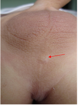 Es el caso de un paciente masculino de 3 años de edad, al interrogatorio de la madre niega antecedentes personales patológicos, hábitos tóxicos u otras enfermedades o complicaciones durante el desarrollo de la gestación, parto y desarrollo del niño. Decide consultar porque el niño estuvo presentando varios episodios de disuria, ardor en la región perianal desde hace más o menos 6 meses de evolución, atendido en varias ocasiones por Pediatría. Al realizarle anamnesis y examen físico urológico al paciente encontramos que a la micción no presenta ningún síntoma urinario obstructivo o irritativo, pero constatamos que en la región perineal justo en el rafe medio proximal al ano la presencia una pequeña pápula enrojecida que humedece muy ligeramente, en ocasiones después de la micción (Ver figura 1).