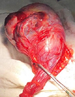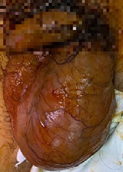 Hombre de 88 años, sin antecedentes relevantes, acude valoración por aumento de volumen escrotal, pujo y tenesmo vesical, en la exploración física se evidencia aumento de volumen en bolsa escrotal izquierda dependiente de crecimiento testicular ipsilateral, aproximadamente 12 x 7 cm (Figura 1), transiluminación positiva, poco doloroso a la palpación; testículo derecho aparentemente normal, ingles sin linfadenopatías palpables. Marcadores tumorales: Gonadotropina coriónica humana cuantitativa, alfafetoproteína y deshidrogenasa láctica dentro de parámetros normales. Paciente presenta estudio ultrasonográfico testicular en el cual se describe testículo izquierdo con parénquima homogéneo, con bolsa quística de 10 cm (hidrocele), presencia de hipoecogenecidad en parénquima testicular mal definida.