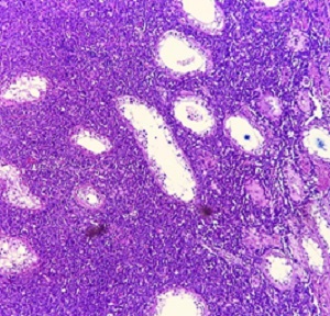 Se realiza orquiectomía radical izquierda ante sospecha de probable tumor sólido asociado a hidrocele (Figura 2). Evolución estable, se egresa sin complicaciones. Reporte histopatológico que describe neoplasia maligna de células grandes compatible con linfoma no-Hodgkin con infiltración a la capa interna de la túnica albugínea, sin invasión vascular, sin infiltración a la rete tesis, epidídimo ni al cordón espermático, completamente resecado y asociado a hidrogene. pT de 3 cm. (Figura 3)