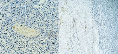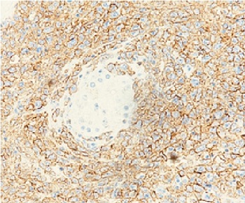 Figura 4 Estudio de inmunohistoquímica que muestra positividad citoplásmica para CD20 en un linfoma primario testicular