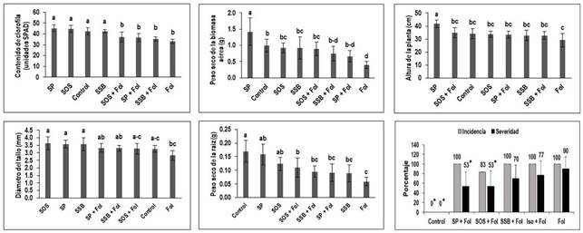 Figura 2 Parámetros de crecimiento, incidencia y severidad de marchitez en plántulas tratadas con SP, SOS, SSB, SP + Fol, SOS + Fol, SSB + Fol, Iso + Fol y Fol. Las medias con la misma letra no son estadísticamente diferentes según la prueba de Tukey (p < 0.05). *Existe diferencia estadísticamente significativa en los tratamientos con respecto a Fol, de acuerdo a las pruebas de Kruskal-Wallis y Mann-Witney (p < 0.05). La línea encima de las barras representa la desviación estándar.