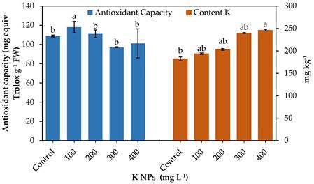 K is one of the nutrients with the greatest influence on the quality parameters of crops. The K NPs foliar application at 100 mg L-1 influenced the highest phytochemical biosynthesis of flavonoids, total phenols and antioxidant capacity with increases of 31.25, 23.48 and 8.50%, respectively, in relation to the corresponding controls. However, by increasing the dose from 200 to 400 mg L-1 there was a decrease in phytochemical compounds (Figure 1).