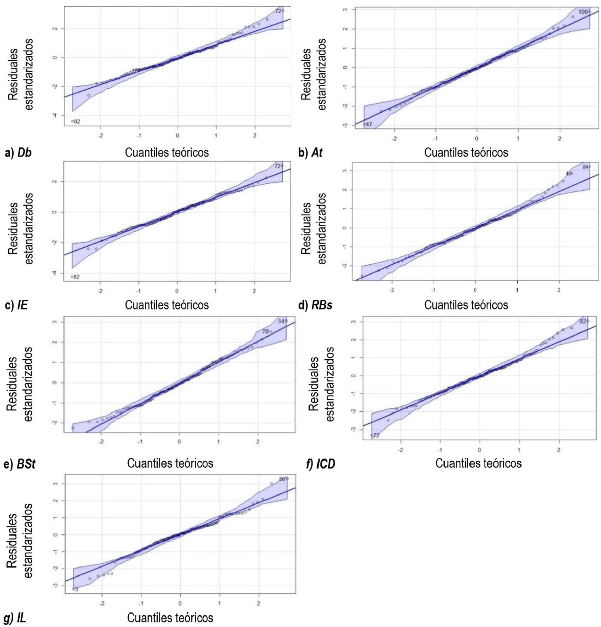Posterior a las transformaciones, los valores obtenidos de las pruebas de Shapiro-Wilk y Levene (Tabla 3, W y F) señalan de manera cuantitativa el cumplimiento de los supuestos de regresión, lo cual se ratifica en el caso de la normatividad en la Figura 1 donde se identifica una tendencia hacia la línea recta entre los cuantiles teóricos y los residuales estandarizados, sin estar fuera de los intervalos de confianza o presentar puntos aberrantes que indiquen problemas de distribución.