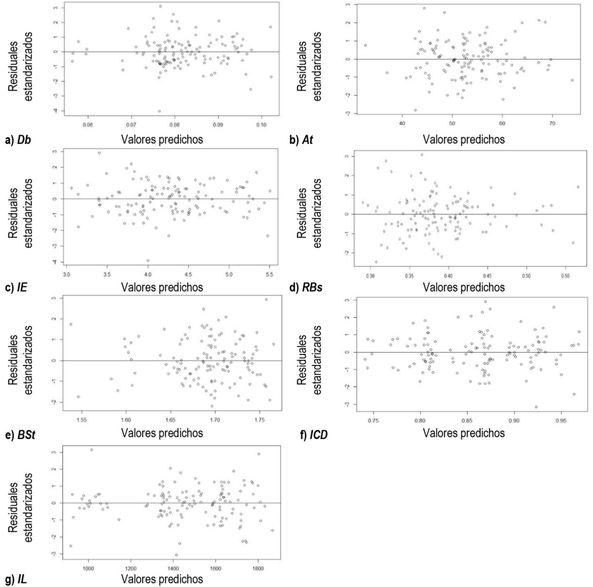 La distribución de los errores del modelo implícito en el ANOVA indica la misma varianza en todos los niveles de las variables independientes utilizadas (cercanos a cero) por los que se puede afirmar homocedasticidad en los residuales con una distribución homogénea en cada caso de las variables de interés (Figura 2). No se observa un aumento de los errores a medida que la variable independiente incrementa en sus dimensiones.