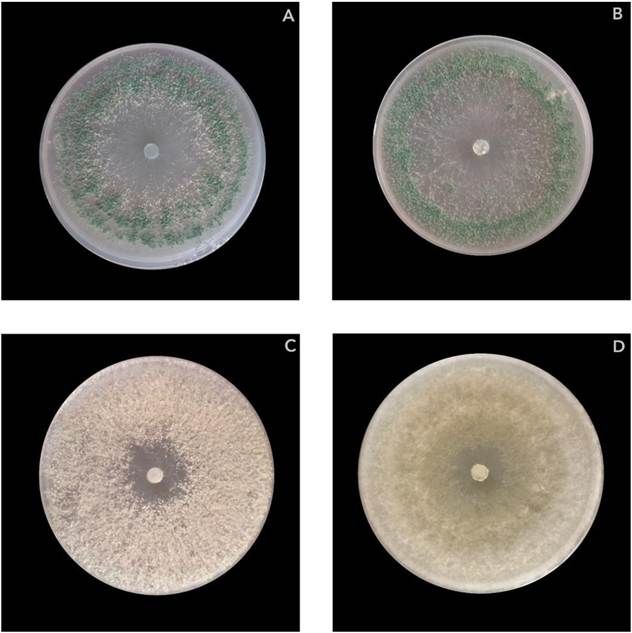 Figura 1 Morfología de aislamientos de Trichoderma de suelo y tejidos de A. potatorum. A. T. asperellum. B. T. yunnanense. C. Trichoderma sp. D. T. lentiforme.