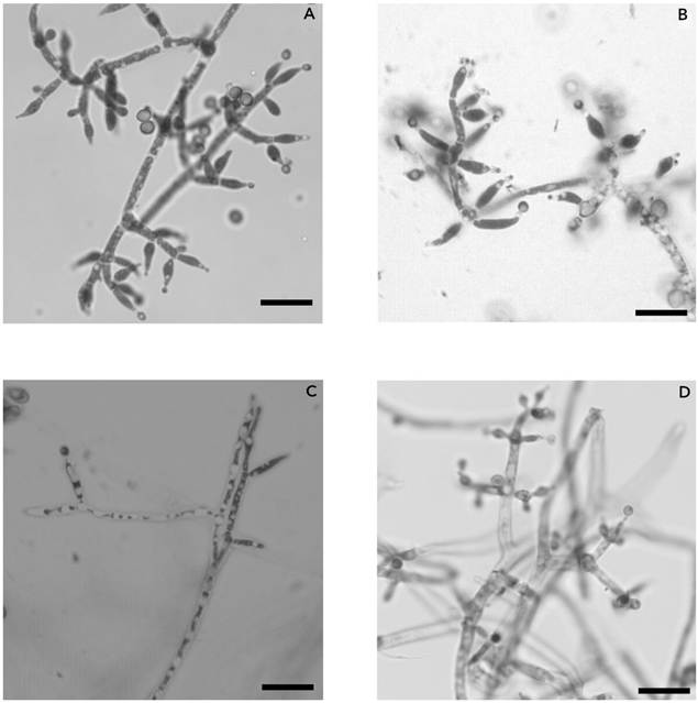 Figura 2 Micrografías de conidióforos de Trichoderma aisladas de A. potatorum. A. T. asperellum. B. T. yunnanense. C. Trichoderma sp. D. T. lentiforme. Barra = 20 µm.