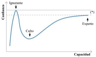 Figura 1: Efecto Dunning-Kruger. (*) Intervalo de confianza: El experto raramente siente tanta confianza como el ignorante.
