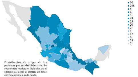 Los pacientes incluidos en el estudio provinieron de 26 de las 32 entidades federativas de la República Mexicana (Figura 1). De acuerdo con las respuestas recibidas, se incluyeron 516 pacientes; 353 (68.41%) fueron mujeres. La edad media fue de 70.09 ± 9.5 años (rango de 23.0 a 89.0 años) y su distribución por edad se muestra en la Figura 2.