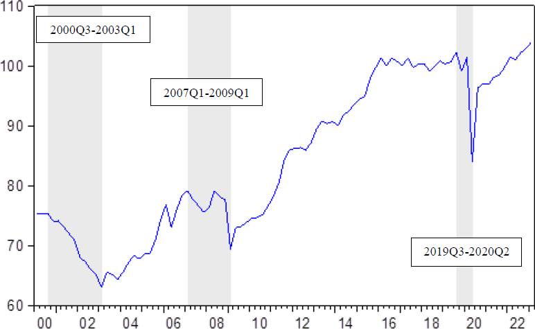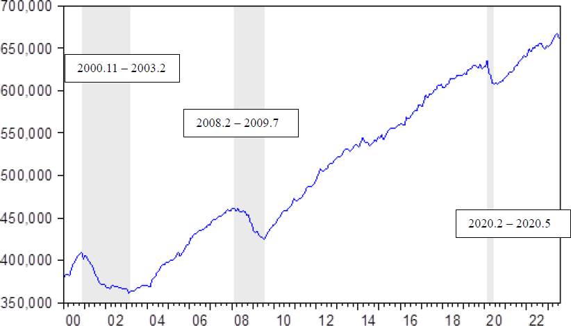 En el marco de las recesiones se analiza el comportamiento del empleo en el período primer trimestre del año 2000 hasta el primer trimestre del año 2023 para ver la manifestación de las crisis en el mercado laboral (privado y formal) de Sonora. Para ello se obtiene información que proviene del IMSS (2023) con respecto al número de personas afiliadas con un empleo. Los datos se presentan con una periodicidad mensual y han sido desestacionalizados a través del método de ajuste estacional census X13 que proporciona el paquete computacional Eviews. Lo anterior se llevó a efecto con la finalidad de fechar los puntos de inflexión de los ciclos teniendo como referencia la variable empleo.