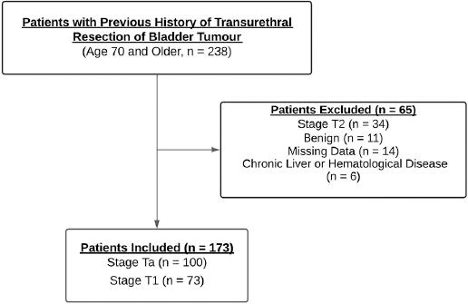 This retrospective study was approved by the Ethics Committee of Dr. Abdurrahman Yurtaslan Oncology Training and Research Hospital (Decision no: 2022-02/51). The study sample comprised 173 patients aged ≥ 70 years who were diagnosed with NMIBC following transurethral bladder tumor resection (TURBT) in our clinic between January 2015 and March 2022. The study exclusion criteria were defined as non-attendance of clinic follow-up appointments, incomplete data, a diagnosis of a muscle-invasive bladder tumor or benign pathology as a result of a pathological examination, or a history of hematological disease, a diagnosis of pneumonia within 3 months before admission, severe hepatic or renal diseases, or an active infection within 2 weeks before admission (Fig. 1).