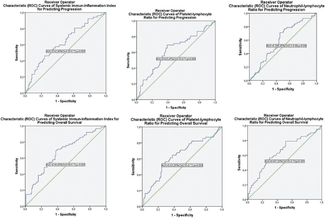 A statistically significant difference was determined between progression and the inflammatory parameters of NLR (p = 0.04), PLR (p = 0.009), and SII (p = 0.007). No significant difference was observed between recurrence and the inflammatory parameters (p > 0.05). A statistically significant difference was determined between overall survival and NLR (p = 0.001), PLR (p = 0.003), and SII (p < 0.001) (Table 2).