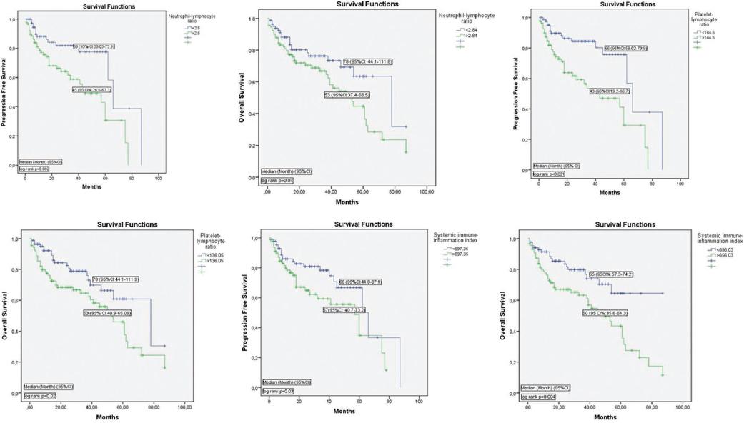 In the Kaplan-Meier analysis examining the PFS and OS curves of the low and high NLR, PLR, and SII groups according to the determined cutoff values. Significant differences were determined between the high and low groups of NLR, PLR, and SII for PFS (log-rank p = 0.002, p < 0.001, p = 0.03, respectively) and OS (log-rank p = 0.04, p = 0.02, p = 0.004, respectively) (Fig. 3).