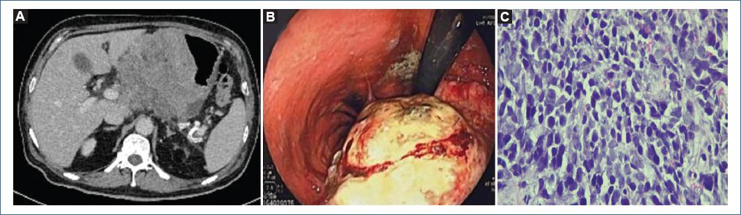 Figura 1 A: lesión tumoral polipoide que afecta toda la curvatura menor de 13.6 × 8.8 cm (imagen tomográfica). B: lesión tumoral irregular, con características irregulares, crecimiento intrínseco, zonas de ulceración y friable al paso del endoscopio (imagen endoscópica). C: proliferación de células redondas a ovaladas, hipercromáticas, de citoplasma escaso y nucleolos poco visibles, con disposición sólida y en nidos celulares que cohesionan entre sí. Tinción hematoxilina-eosina, 40 X.