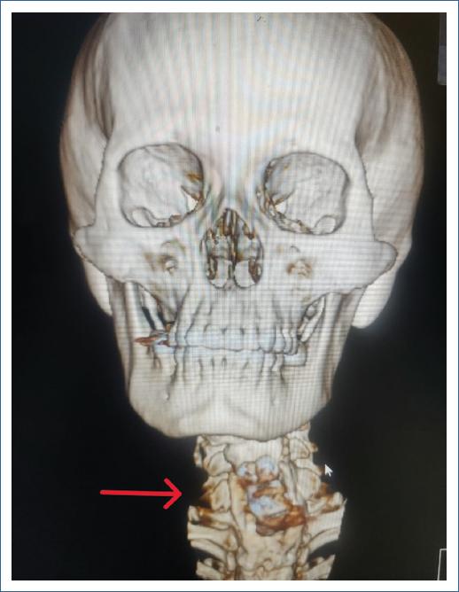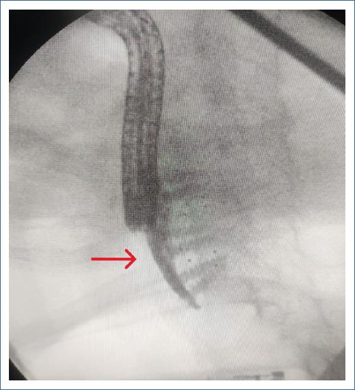 Mujer de 64 años de edad con antecedente de abordaje anterior cervical con colocación de material protésico a nivel de C5-C7 hace seis años por patología degenerativa de la columna cervical, donde se produce una perforación esofágica, la cual es manejada con cierre primario + gastrostomía en el mismo acto quirúrgico; a los pocos días del posquirúrgico presenta fistula esófago-cutánea con gasto siálico, el cual se maneja de forma conservadora (Figs. 1 y 2). Ante el cese de gasto de fistula se inicia tolerancia de alimentos con adecuada respuesta; a los dos años presenta leve disfagia a sólidos, para lo cual se realiza panendoscopia de control, la cual reporta estenosis 20% franqueable a nivel de cricofaríngeo. La paciente continúa con valoraciones frecuentes de manera anual por parte del servicio de endoscopia, sin embargo, ante la presencia de mayor disfagia a sólidos y en el último mes a líquidos, se realiza valoración endoscópica a los seis meses de su último control donde se identifica estenosis esofágica 50% + material de osteosíntesis en la luz esofágica a nivel del cricofaríngeo, hallazgo no encontrado en su último control (Fig. 3). Paciente al momento de su valoración hemodinámicamente estable, sin respuesta inflamatoria, sin sepsis, sin dolor; sin embargo, con alto riesgo de osteomielitis a nivel cervical, por lo cual se envía al servicio de cirugía de columna para valoración de los hallazgos descritos.