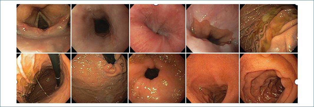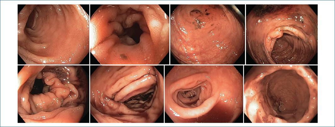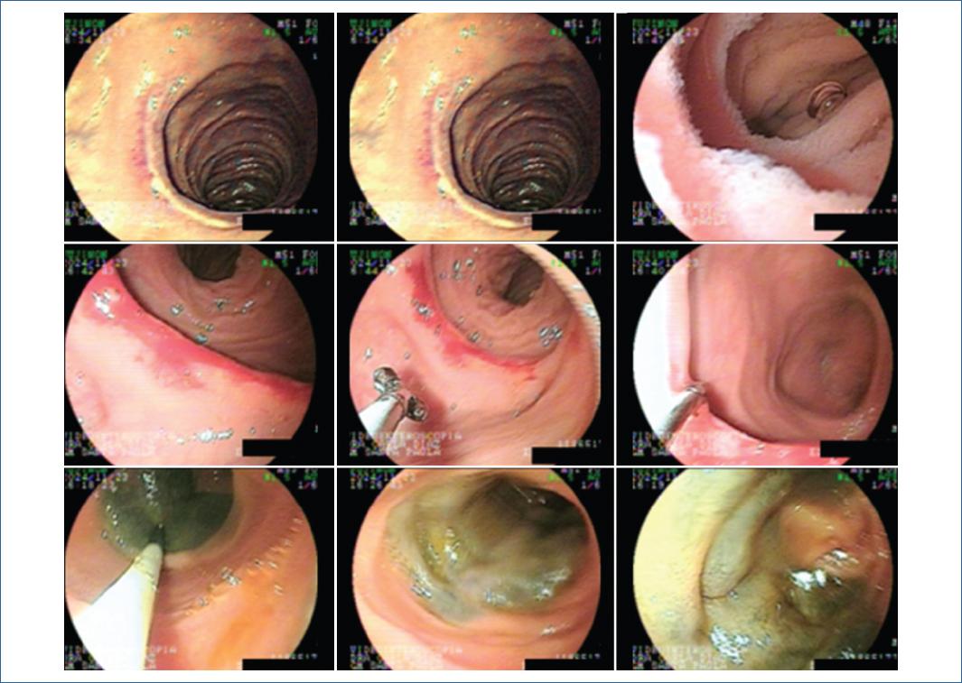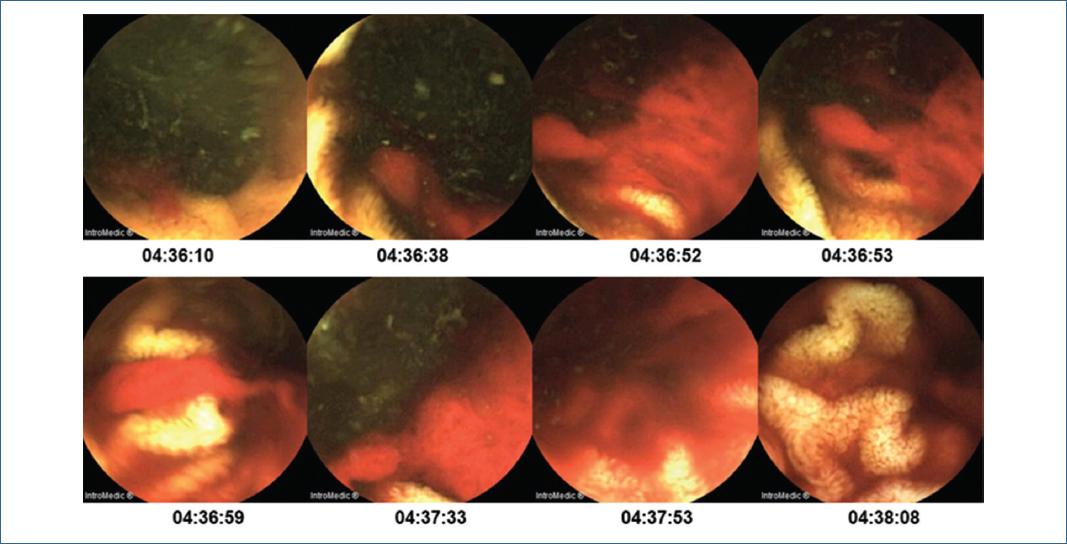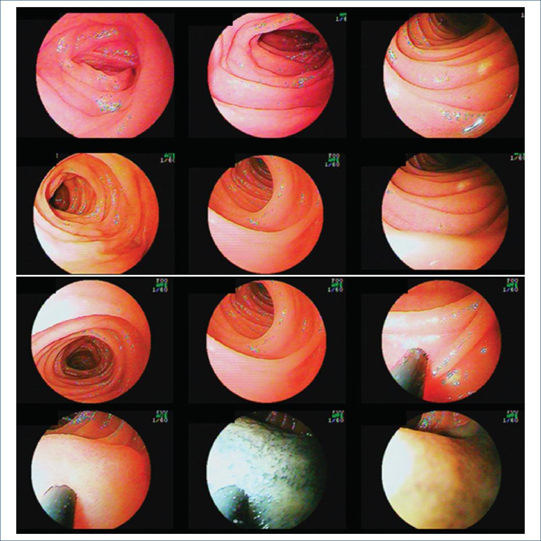 Paciente de sexo masculino de 49 años de edad, procedente de una región en las afueras de la capital, deportista, sin antecedentes patológicos, consumidor de AINE. Ingresa de emergencia con cuadro agudo caracterizado por hematoquecia múltiples episodios, con descompensación hemodinámica que progresó a shock hipovolémico ameritando transfusión de hemoderivados para estabilizar volemia y es referido en aeroambulancia a la capital. Ingresa a nuestro centro hemodinámicamente estable, por lo que se procede a la realización de estudios endoscópicos superior (Fig. 1) e inferior (Fig. 2), sin evidenciarse alteraciones. Durante la videocolonoscopia se intuba la válvula ileocecal y se progresa en íleon hasta 40 cm en profundidad sin evidencia de hallazgos patológicos, solo presencia de restos hemáticos en íleon y todo el trayecto colónico, por lo que se decide realización de videocápsula endoscópica MiroCam® SB (Fig. 3), En esta se observa: a los 260.86 min del tránsito intestinal (TI) (68.3% del TI) se evidencia sangrado activo, y desde los 260.86 min (68.3% del TI) hasta los 265.29 min (69.5% del TI) se evidencian abundantes restos hemáticos rojos con coágulos sugestivos de sangrado activo intraluminal intestinal. En vista de los hallazgos se concluye la cápsula endoscópica como hemorragia en intestino medio evidente en íleon proximal activo. Se procede a realizar enteroscopia asistida por dispositivos con enteroscopio doble balón, Fujinon®, abordaje combinado. Se inicia enteroscopia doble balón Fujinon® vía anterógrada (oral) (Fig. 4): se avanza hasta íleon proximal, aproximadamente 560 cm en profundidad (14 avances efectivos). A nivel de 1/3 medio de yeyuno se evidencian dos lesiones planas, de aproximadamente 10 mm, amarillentas, redondeadas, con bordes definidos. Se concluye el procedimiento a la hora y 30 min de intubación profunda del intestino delgado. Se realiza tatuaje con tinta china en el sitio de máxima inserción en profundidad. Se concluye: 1) xantomas yeyunales, y 2) tatuaje intestino delgado. A las 12 h se realiza enteroscopia doble balón Fujinon® vía retrógrada (anal) (Fig. 5): se avanza hasta íleon proximal, aproximadamente 320 cm en profundidad (8 avances efectivos). Se evidencia gran úlcera arciforme que ocupa 3/4 de la circunferencia de la luz intestinal, bordes definidos sobre área mucosal fibrótica con luz intestinal dilatada en sentido proximal. Se toman biopsias. Se concluye el procedimiento a las 2 h de intubación profunda del intestino delgado. Se realiza tatuaje con tinta china en el sitio de máxima inserción en profundidad. Se concluye: 1) enfermedad diafragmática secundaria a enteropatía por AINE, y 2) tatuaje intestino delgado
