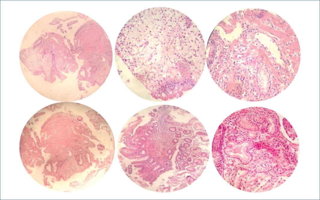 Los resultados histológicos reportan (Fig. 6) hallazgos microscópicos de mucosa intestinal focalmente erosionada, vellosidades con altura y amplitud usual, distorsión leve de criptas, expansión de la lámina propia por edema y leve infiltrado inflamatorio mixto, con predominio de eosinófilos, hipertrofia de la muscularis mucosae, leve proliferación capilar y fragmento aislado de tejido paucicelular, que pudiera corresponder a una membrana neoformada. Conclusión: hallazgos histológicos compatibles con enteropatía crónica asociada a AINE, con erosión focal, cambios reparativos y esosinofilia; no hay evidencia de neoplasia, no se observan vasos sanguíneos hipertróficos.