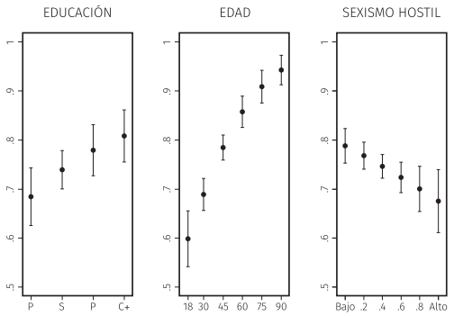 En la Gráfica 1 se reporta el efecto sustantivo tanto del sexismo hostil como de la educación y la edad en la participación en las elecciones. Por ejemplo, los votantes que reportan bajos niveles de sexismo hostil, tienen una probabilidad de participar en las elecciones del 77 %. Pero un votante con muy altos niveles de sexismo hostil, tiene una probabilidad de votar de 67 %. Además, como se puede apreciar, los votantes universitarios tienen una mayor probabilidad de participar (81 %) el día de la jornada electoral comparado con los votantes sin educación/educación primaria (68 %, p<0.01). Los votantes de 18 años tienen una probabilidad de votar de 60 %, mientras que alguien de 65 años de edad tiene una probabilidad de 86 %.