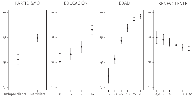 Para el caso de los votantes con actitudes sexistas benevolentes la direccionalidad de la hipótesis no es clara. Intuimos que la dirección es positiva si las mujeres candidatas están cobijadas por hombres. La dirección es negativa si las mujeres no son respaldadas y avaladas por hombres pertenecientes a la clase política. En este sentido, Winter (2023) sostiene que los sexistas benévolos prefieren que la persona candidata tenga un estilo de liderazgo masculino (alguien fuerte y decisivo) y los que tienen un bajo nivel de sexismo benévolo prefieren un estilo de liderazgo femenino (alguien que coopera y colabora), independientemente del sexo de la persona candidata. De modo que quizá el género de la persona candidata no es particularmente relevante para este último caso.