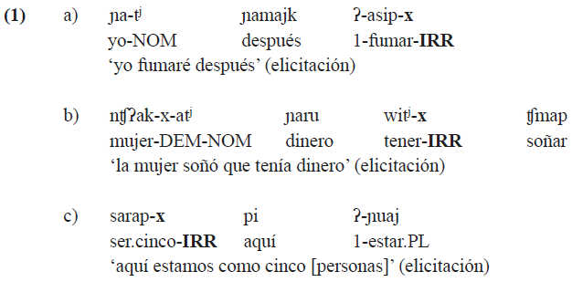 En el resto del artículo no se tomarán en cuenta los sufijos -k y -kum ya que, como lo mencionamos anteriormente, existen tendencias a omitirlos en ciertos contextos, lo que complica la elección de material para el análisis. Por la misma razón excluimos de nuestro análisis las bases verbales que terminan en [x] (por ejemplo, aλox ‘roncar’); ya que, en este caso, el sufijo -x se fusiona con la base y, por lo tanto, las formas en irrealis no se contrastan formalmente con las formas en realis.