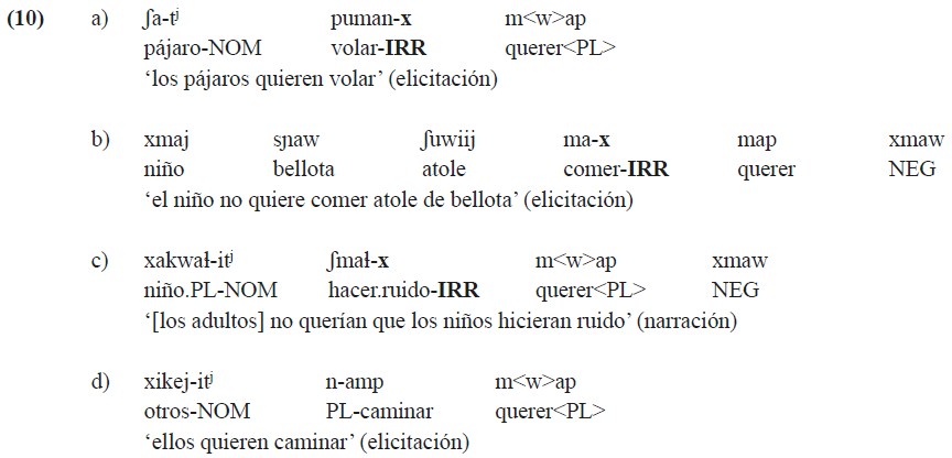 El verbo ‘querer’ en (10) está en tercera persona (sin una marca morfológica), lo que indica que no se trata de la actitud del hablante hacia el evento. El contraste entre los ejemplos (10a) y (10b), y (10c), demuestra que el uso del irrealis en contextos optativos no está vinculado a una referencia temporal específica y no se limita a deseos actuales. Los dos primeros ejemplos describen eventos en el presente, mientras que en (10c) se trata de cómo eran las costumbres funerarias del pasado que ya no se mantienen hasta la actualidad.