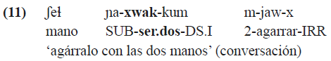 Como se observa en (10d), el sufijo -x puede no aparecer en algunos contextos potenciales. Aunque los casos de omisión de dicho morfema son poco frecuentes en construcciones de deseo, la opcionalidad del sufijo -x se manifiesta con más claridad en otros tipos de contextos (ver más adelante). Las inconsistencias en el uso de este morfema naturalmente causan dudas acerca de su estatus y hacen sospechar sobre la presencia de ciertos procesos diacrónicos de reestructuración del sistema verbal que todavía quedan por aclarar mediante estudios futuros. Curiosamente, al mismo grupo de contextos potenciales se le puede atribuir los verbos con significado numeral, como ‘ser uno’ o ‘ser dos’, que toman el mismo sufijo -x. En KSJZ las bases numerales tienen todos los rasgos morfosintácticos propios de los verbos. Miller (2001) utiliza el término “enumerativos” para estos verbos en tiipay de Jamul. El ejemplo (11) ilustra el uso del verbo xwak ‘ser dos’ en KSJZ.