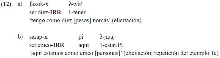En (11), la base xwak ‘ser dos’ exhibe dos propiedades morfosintácticas típicamente verbales. Se le añaden el prefijo ɲa- que se utiliza para formar cláusulas subordinadas y el sufijo de alternancia de sujeto -kum. Con verbos enumerativos que tienen una semántica léxica muy específica, el significado irreal se interpreta como falta de exactitud. El sufijo -x que se añade a una base verbal que indica un número da lectura de una cantidad aproximada (12).
