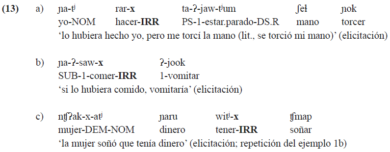 Como se puede observar en (13), ninguna de las tres situaciones descritas por las formas verbales que llevan el sufijo -x es real, y todas son imaginarias, ya que nunca sucedieron y las condiciones dadas en el mundo cancelan la posibilidad de que sean realidad.