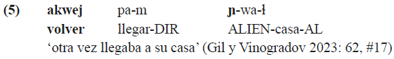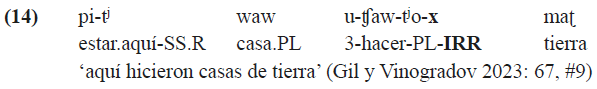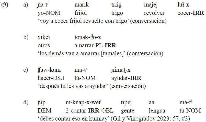 Es importante mencionar los sufijos de alternancia de referencia (switch reference, en inglés) que se añaden a las formas sintácticamente dependientes de los verbos e indican si su sujeto coincide con el sujeto de la cláusula principal o no. Aunque las reglas de omisión de dichos sufijos todavía quedan por aclarar (Gil y Vinogradov 2022), debe notarse que existen los sufijos de alternancia de referencia específicos tanto para el realis (-t j para el mismo sujeto y -t j um para distinto sujeto) como para el irrealis (-k para el mismo sujeto y -kum para distinto sujeto)8. Los sufijos de alternancia de referencia que corresponden al irrealis se ilustran en (8).