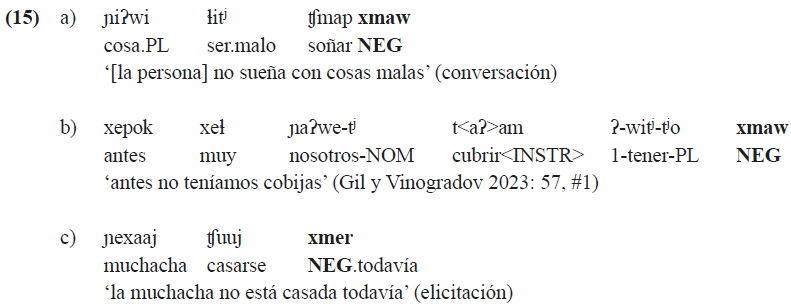 La contrafactualidad naturalmente se aproxima a la negación que también alude a algo que no pertenece al mundo real. Aunque sincrónicamente las construcciones negativas en KSJZ no llevan el sufijo de irrealis, como en (15), es notable que el elemento x aparece al inicio de todas las partículas negativas. Ello permite reconstruirlo como el sufijo de irrealis añadido a la palabra verbal que después se fusionó con la palabra posterior y se reanalizó como parte del morfema negativo; véase Miller (2001) para la discusión más detallada del mismo proceso diacrónico en el tiipay de Jamul.