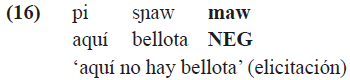En el caso de predicaciones nominales, la negación se realiza mediante la partícula negativa maw que carece de x inicial (16).