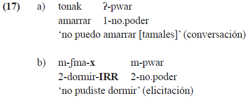 Finalmente, debemos admitir que existen casos dudosos, en los cuales el uso del sufijo de irrealis parece opcional. Esto sucede en construcciones con algunos verbos auxiliares; por ejemplo, el verbo pwar ‘no poder’ (17).