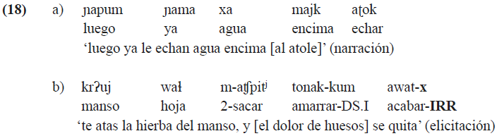 A primera vista, la diferencia semántica entre (17a) y (17b) no está clara. Se necesita un estudio más detallado para entender qué es lo que aporta el sufijo -x al significado del predicado en contraste con las cláusulas sin este sufijo. La misma falta de una tendencia consistente al emplear o no el sufijo de irrealis concierne a las situaciones habituales y genéricas que no tienen un anclaje fijo en el eje temporal. Las interpretaciones de este tipo suceden, por ejemplo, en las descripciones de actividades culturales y en instrucciones; véase el contraste entre (18a) sin la marca de irrealis y (18b), donde el último verbo toma el sufijo -x.