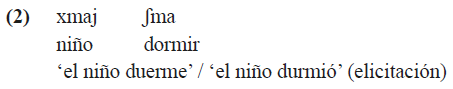 La palabra tnaaj ‘ayer’ indica explícitamente el tiempo del evento en (3a). En (3b), la secuencia cronológica de los eventos se establece por medio de la palabra ɲaʧaw que tiene origen verbal; a la raíz ʧaw ‘completar’ se le añade el “prefijo sintáctico” ɲa- que en este contexto puede ser traducido como ‘cuando’.