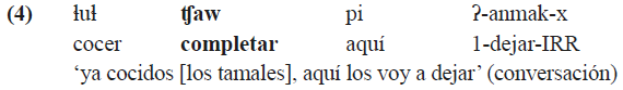Algunos significados de índole aspectual se expresan en KSJZ por medios perifrásticos utilizando verbos auxiliares que se caracterizan por distintos grados de pérdida de sus propiedades léxicas o morfosintácticas. A continuación, se ilustran dos de este tipo: la construcción completiva incluye el verbo ʧaw ‘hacer, completar’ que carece de flexión personal (4), mientras que la construcción con el verbo auxiliar akwej ‘volver’ denota un evento iterativo (5).